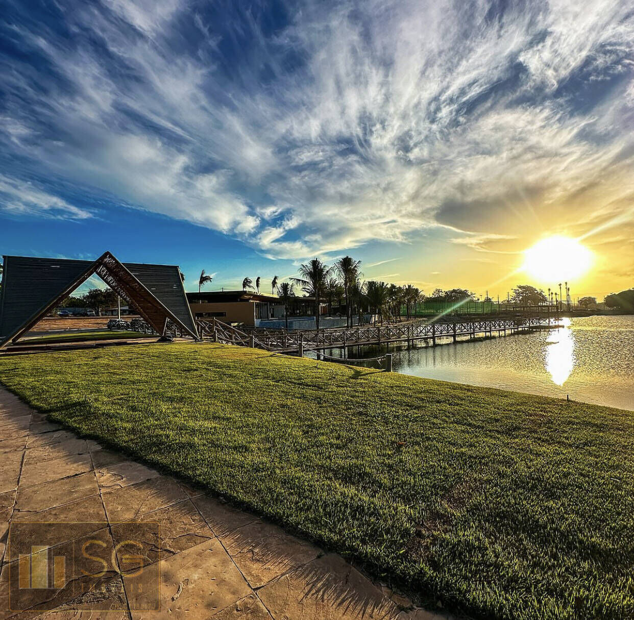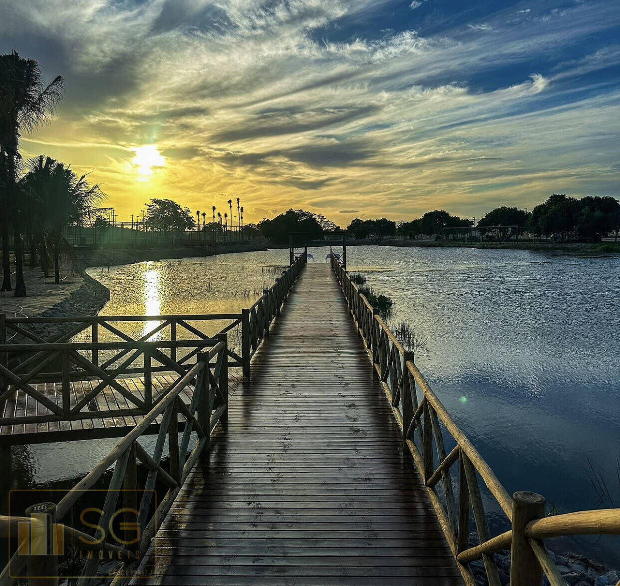 Lago natural com pier e prainha com coqueiral
